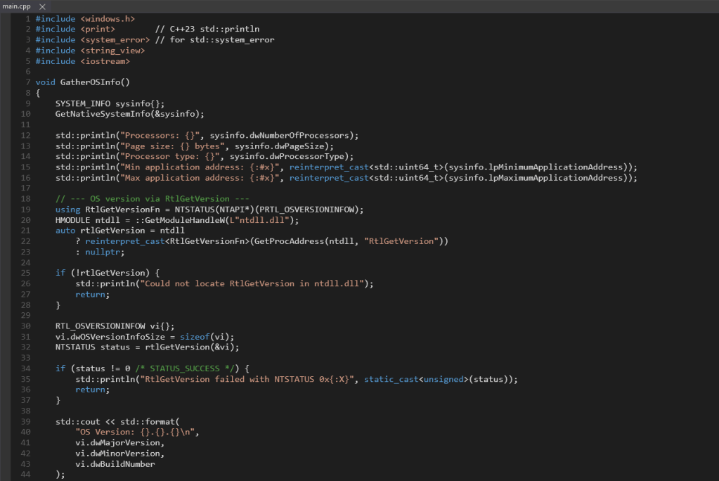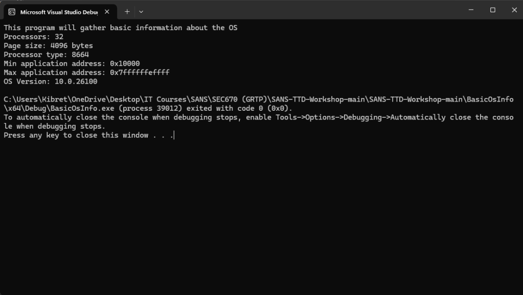 The “BasicOSInfo” code, authored by Kevin Ott, serves as a practical example for demonstrating TTD. This program is designed to extract fundamental operating system information, such as minimum and maximum memory addresses utilized by the application and page size. It also leverages the undocumented rtlGetVersion function within ntdll.dll to retrieve the major version, minor version, and build number of the operating system.