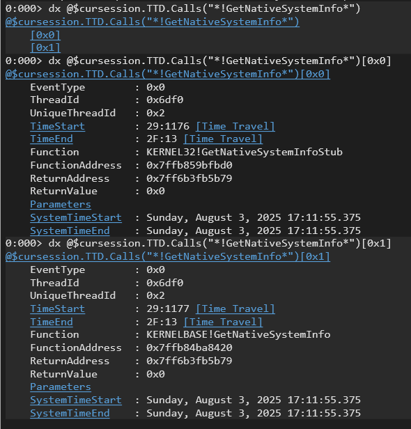 A specific example is dx @$cursession.TTD.Calls(“!GetNativeSystemInfo“), which enumerates all instances where the GetNativeSystemInfo function was called. Adding EventType ([0x0], [0x1]) can provide further details about the call events.