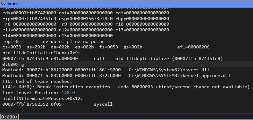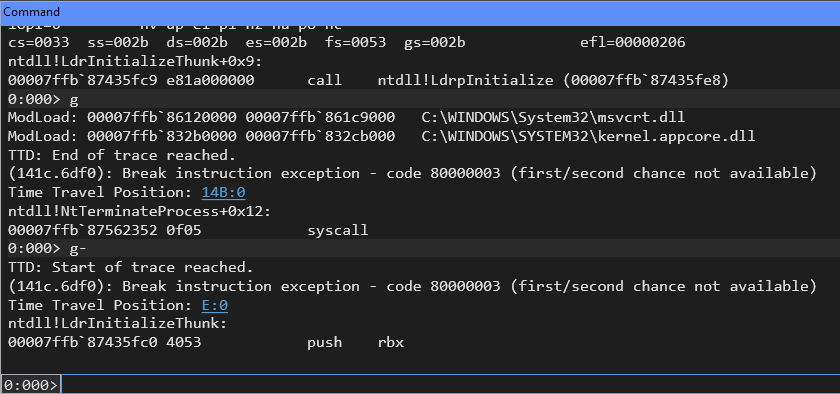 However, with TTD active, the g- command (go backward) allows you to return to the beginning of the trace, preserving your analysis session.