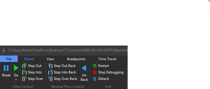 New controls appear in the top-left corner of the WinDbg window when TTD is active: “Step Out Back,” “Step Into Back,” and “Step Over Back.” These are collectively known as “Reverse Flow” controls, enabling backward navigation through the execution.